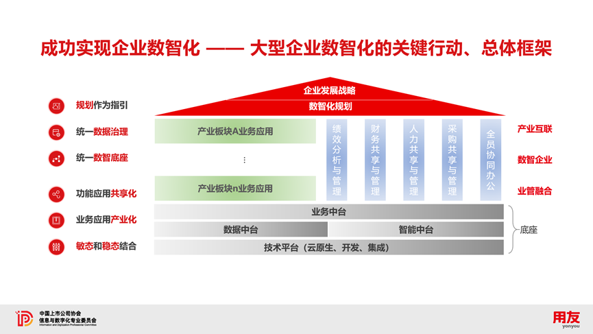 王文京强调,,,在整个大型企业推进数智化的进程中,,,,一个重要的部分就是数智底座,,,,其中涉及了技术平台,,,,数据中台,,,智能中台、、、、业务中台,,,,尤其是技术和数据是当前大型企业升级数智化系统的关键基础。。。