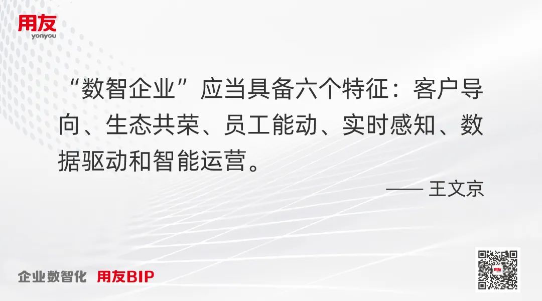 企业推进数智化,,实际上就是要把企业从现有的发展,,,,推进转变为一个“数智企业”,,那么,,,,什么是“数智企业”???王文京认为,,,,区别于非数智企业,,“数智企业”应当具备六个特征:客户导向、、、、生态共荣、、员工能动、、、、实时感知、、数据驱动和智能运营。。成为“数智企业”,,,,是为了给企业创造更大的价值,,,,最终的目标是为了企业实现高质量发展,,,,让企业有更高的经营绩效,,,有更强的竞争优势,,以及更可持续的发展。。。