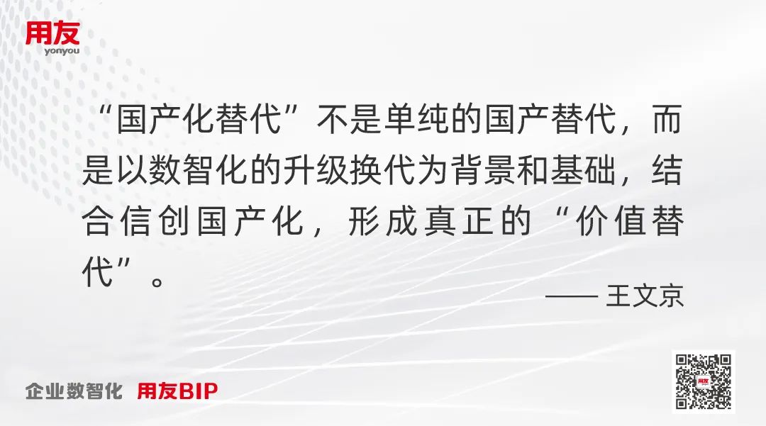 目前,,我国企业的数智化进程正处于发展期,,当越来越多的中国企业尤其是上市公司中的优秀企业,,,它们的数智化建设已经在所处产业和行业中走到全球前列时,,,,软件自主创新与国产化替代的重要性也在进一步凸显。。王文京认为,,,国产化替代不是单纯的国产替代,,,而是以数智化的升级换代为背景和基础,,,,结合信创国产化,,以新一代技术和产品使能企业的数智化,,,形成真正的价值替代。。。