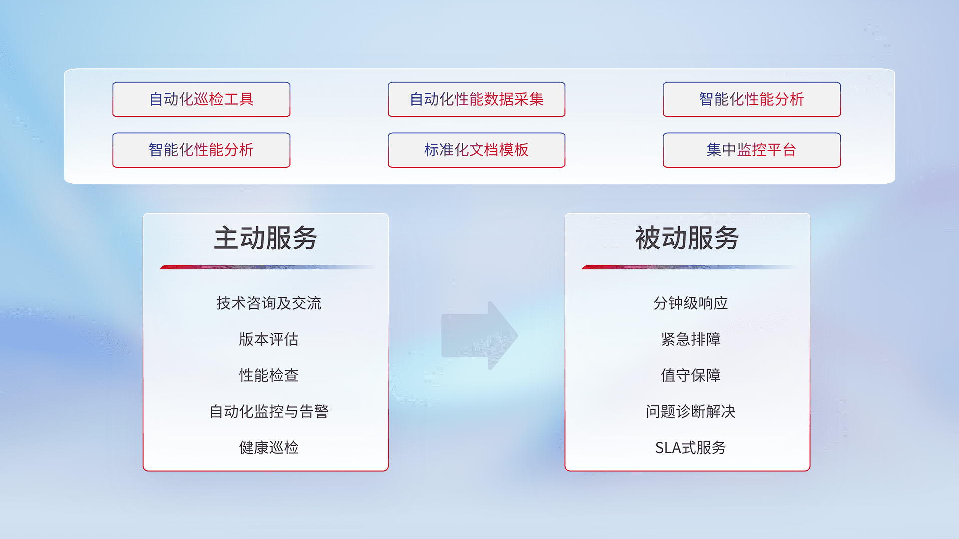 智能化工具和标准化文档,,保障服务质量,,提供主动服务(包含技术咨询、、版本评估、、、性能检查、、、自动化监控与告警、、、健康巡检)和被动服务包含(分钟级响应、、紧急排障、、、、值守保障、、问题诊断解决、、、SLA服务)。。