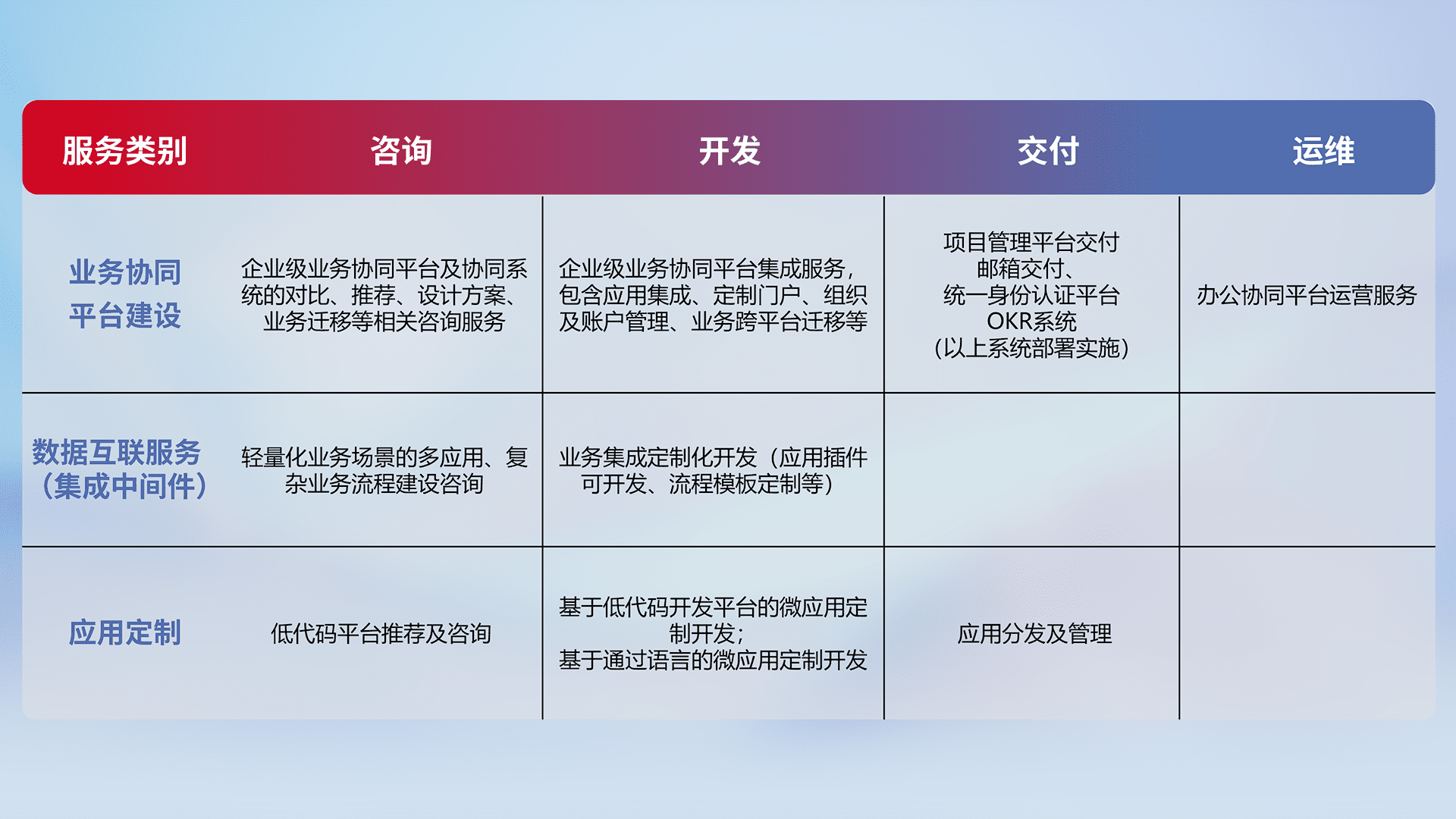 针对钉钉、、、、企微、、、、IDaas等平台级产品提供产品的规划、、、方案、、交付、、、、定制化开发等服务,,,实现如统一协同办公、、、、智能客户服务、、、、混合会议管理、、、、智能数据查询、、、、等业务场景,,实现数字化转型。。。。